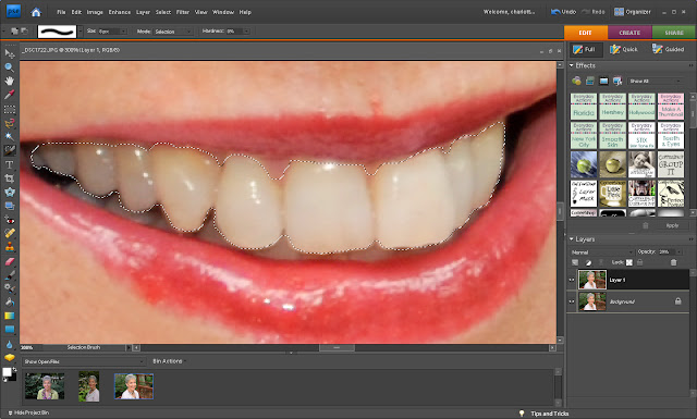 Grab a white paint brush and brush all over the teeth. The selection lines will keep it in bounds. I set my opacity at 29%, the same as the eyes. And it looks natural to me.This is what you will get: